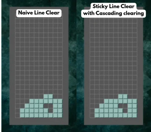 - The “Sticky” line clear logic took an entire day. It may not be the most optimized way, but this is how I did it: I separated the line-clear code from the block movement code, then used a flood fill algorithm to identify groups of connected blocks and drop them until they hit a collision (hitting either the floor or another frozen group of blocks).